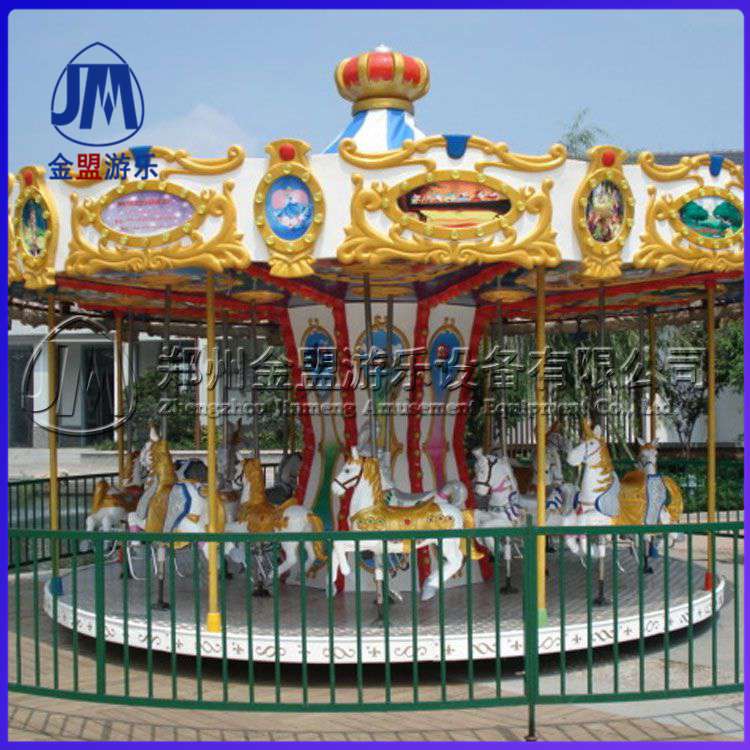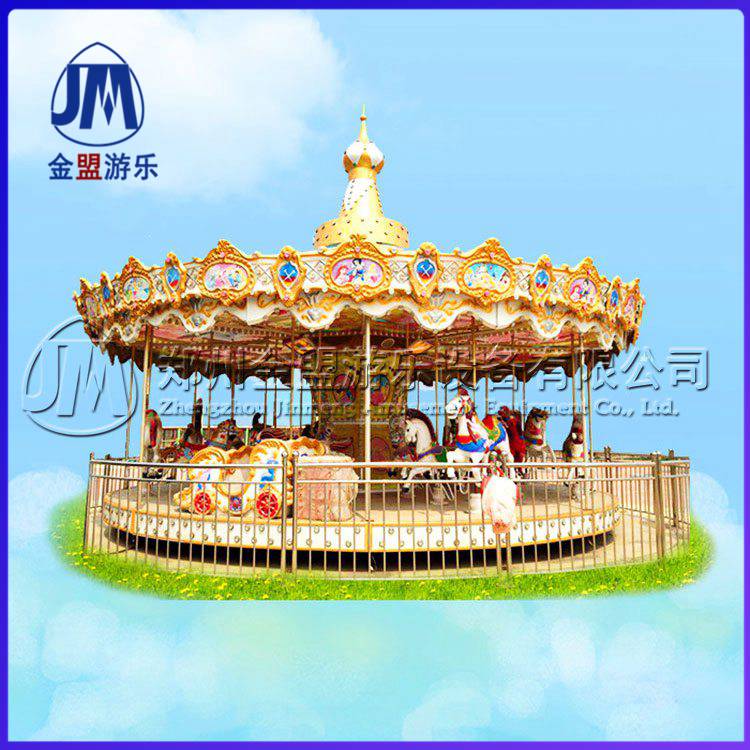 豪华转马,顾名思义就是豪华的旋转木马,它是 种垂直轴类单转体起伏型游艺机,是模拟马厅的娱乐活动而设计的,该游艺机上部设有彩色的锥形顶棚,顶棚的周圈装有五彩缤纷玻璃钢装饰板,更显豪华气派,俨如华丽的马厅。游乐设备更新换代的越来越多,那么有一种游乐设备经过很长时间也还是深受欢迎的,豪华转马怎么会这么受人喜欢?