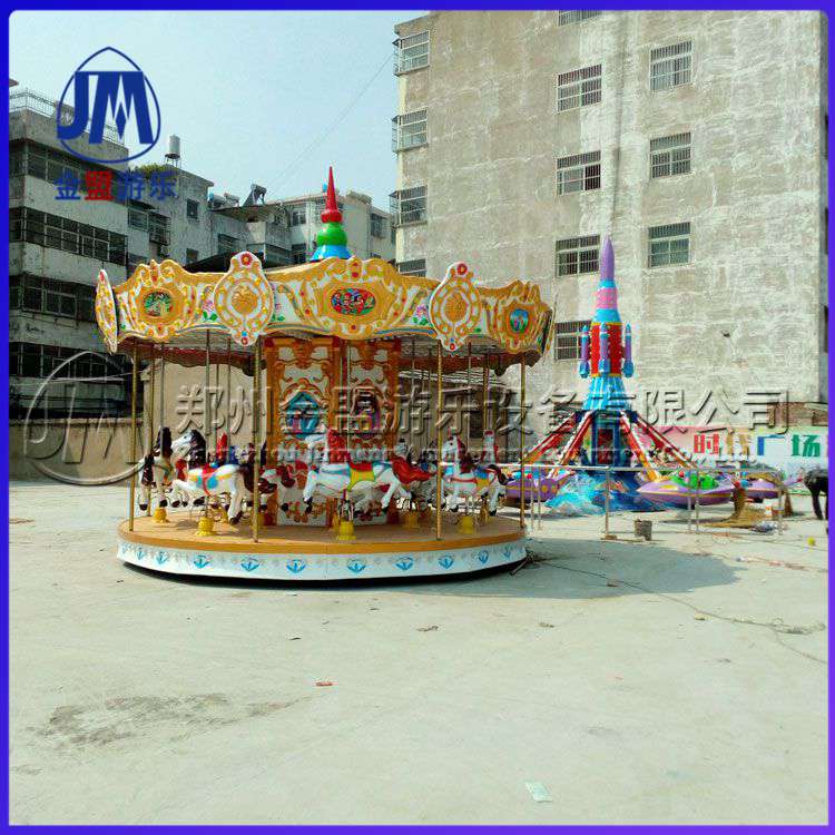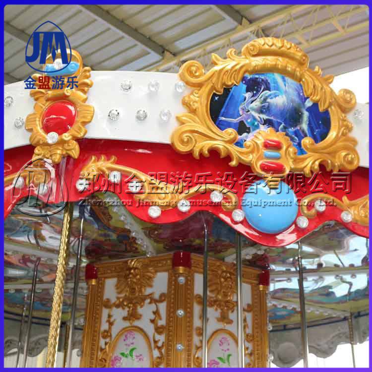 豪华转马游艺机是模拟马厅的游乐活动而设计的,该游艺机的上部设有彩色的锥形顶棚,顶棚周围装有五颜六色的玻璃钢装饰板,更加豪华气派、俨如华丽的马厅。设备启动后,金光银光,姗姗相应,马群、马车竞相赛跑,形成个万马奔腾的场面,乘客如同参加场马比赛,无不感到心旷神怡,乐趣无穷,装饰部分采用玻璃钢 以及彩色蘑菇灯、灯带、彩灯管的灯光效果,让夜幕中的 转马更加亮丽璀璨。在转马依照欧式建筑的风格,用 罗马柱装饰使旋转木马更加的典雅。旋转木马要注意以下几个方面:1、首先转马是种非刺激性游乐项目,它主要依赖漂亮的外观造型,绚丽多彩的灯光和美妙的音乐吸引人,所以说转马的整体造型是非常非常重要的。