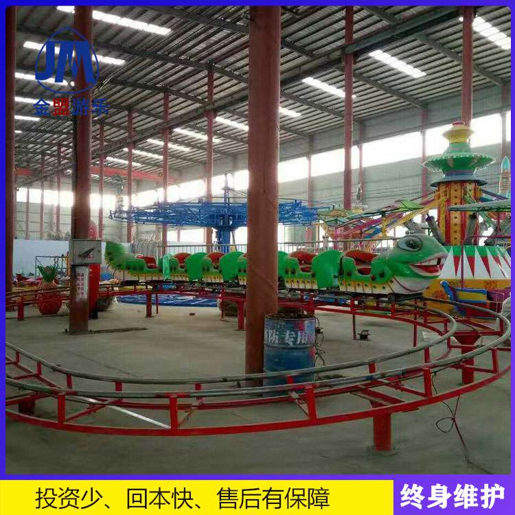 青虫滑车以一条青虫的外形代替了传统的轨道小火车,避免了人们视觉审美上的疲劳,让人感到眼前一亮,尤其对于小孩子更有吸引力。调皮可爱的大青虫子,载着孩子们的笑声,奔向了他喜欢的红苹果。 立体的轨道也弥补了平行单层轨道的枯燥乏味,上坡下坡,惊险拐角,在轨道上奔跑,轨道运行流畅弯曲盘旋,紧扣小刺激,大多数人都能经受得起。弯弯曲曲的轨道增加了孩子们游玩的乐趣,本产品设计新颖,结构独特,外形优美,是投资商的选择。