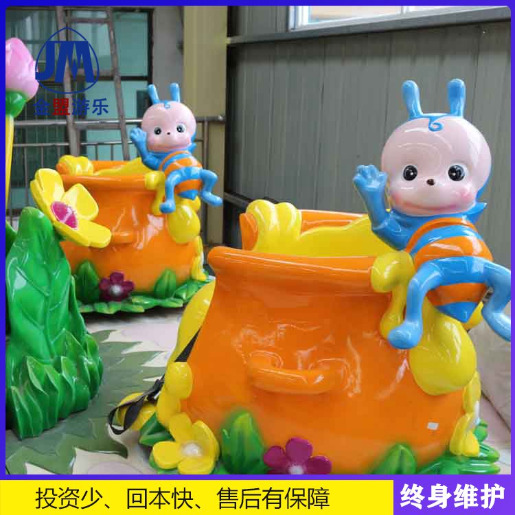 蜜蜂转杯儿童游乐设施,是一种性价比较高的新型游艺机,价格也不贵,有6杯和4杯,除了具有6杯的功能外,还可以交互旋转,相互交叉运行,这样增加了设备的趣味性和刺激性。设备造型新颖是一款非常好玩的游乐设施,欢迎大家来我们厂家订购!新颖的游乐场游乐设施是一种小型转转杯设备,又叫回转蜜蜂!新颖的花朵 蜜蜂造型深受小朋友的喜爱。设备旋转的同时杯子自己也会跟着旋转,两种旋转叠加在一起,乘坐中会有更多乐趣。此设备旋转速度可调,设备无须做基础,方便安装与运输,适合在商场、广场或室内经营。