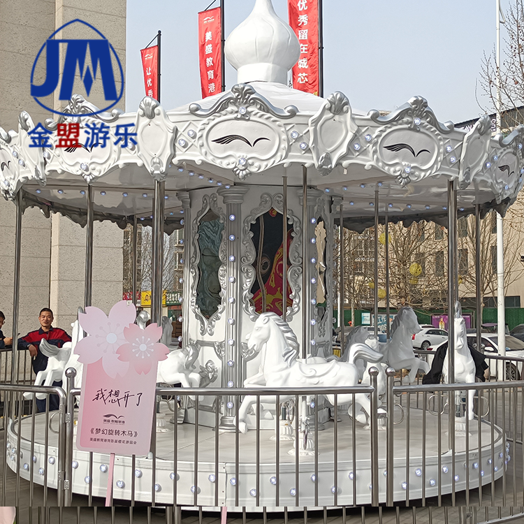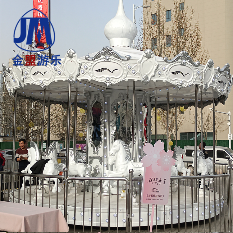 豪华旋转木马是青少年喜欢骑的儿童游乐设备。它具有噪音低,重量轻,省电和乘坐舒适的优点。它是大多数游客的好评,是一种垂直轴单圈起伏的儿童游乐设备。设计用于模拟厅的活动。 机的上部设有彩色锥形天花板,天花板的外围装有彩色玻璃纤维装饰面板。 更加豪华的风格,像是华丽的大厅。 在大厅中间,有滚动的马匹和马匹。 设备启动后,金色和银色的灯光都闪烁着,马车竞相形成了数千匹马的场景。 乘客感觉自己正在参加比赛,他们都感到轻松愉快!