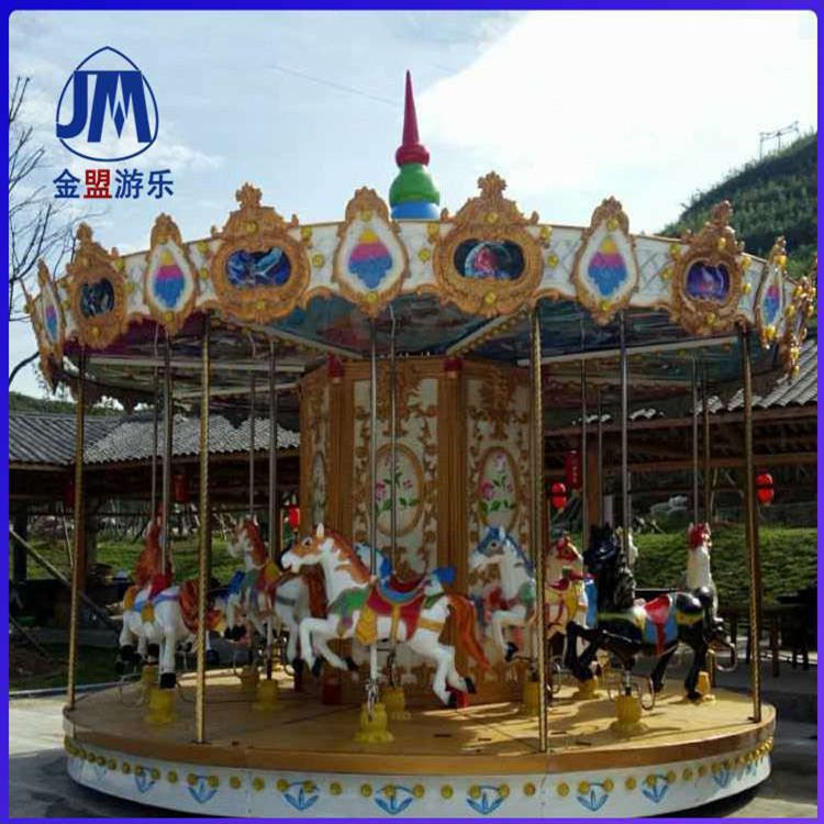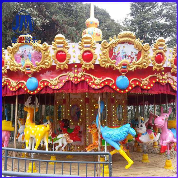 旋转木马是游乐场机动游戏的种,在个旋转的平台上有座位供游客乘坐,这些座位传统上都会装饰成木马,并且会上下移动。由于人类系统中的前庭系统,具有侦测地心引力,维持身体平衡及促进其他神经系统发展的功能。所以前庭系统功能失调时,不仅会影响孩子的平衡及动作反应,甚至会使学习能力减低。因此,如何利用儿童游乐场,以帮助孩子前庭系统功能发展,实在值得注意。旋转木马被誉为游乐设备永不谢幕的经典,它在我国的市场也是片红海,大大小小的公园、游乐场都会安置套旋转木马,为了不被市场淘汰,旋转木马生产厂家也在不断研发新型的旋转木马。郑州金盟旋转木马外型美观,色彩鲜艳,