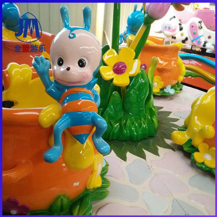 咖啡杯转杯又叫转盘,是种仿咖啡杯旋转类的儿童游乐设备,座舱采用玻璃钢制作而成,每只花房造型的杯子上都有两只顽皮可爱的采蜜,整体造型梦幻卡通效果,是深受孩子们喜爱的儿童游乐设备。该咖啡杯转杯设备在运行时底盘旋转的同时每只杯子也能360°旋转,加上彩灯闪烁,更加新鲜好玩。设备旋转的同时杯子自己也会跟着旋转,两种旋转叠加在起,乘坐中会有更多乐趣。此设备旋转速度可调,设备无需做基础,方便安装与运输,适合在商场、广场或室内经营。