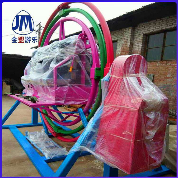用少量的力本产品是 种立体旋转游乐设备,其包括支架、外框和位于外框内的内框,所述支架设有两个相对的支撑,即可使内框和外框同时旋转,人也跟着发生旋转,从而达到游乐的目的。当人在产品内部360度旋转的时候,犹如在太空遨游 样,感觉非常的独特,刺激。同时也能达到健身的目的。