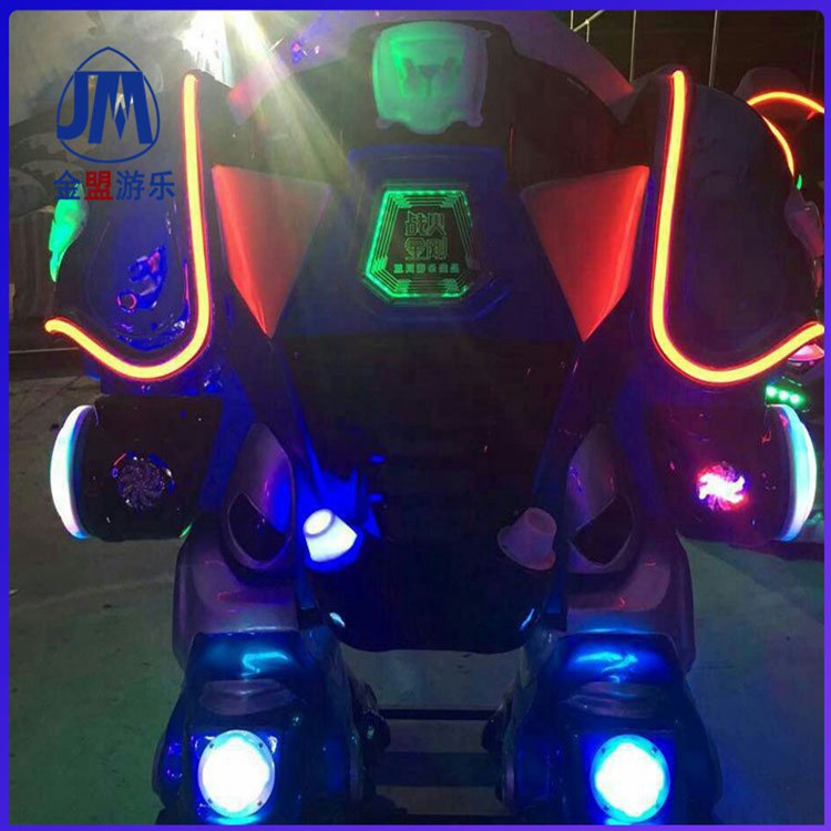行走机器人造型科幻、霸气,灯光绚丽,乘坐方式独特,吸引力无法抗拒,是游乐产品设计的一次重大突破。双摇杆操作,乘客可自由、轻松掌控行驶方向,可前进、后退、原地360度旋转、趣味性。形态逼真,灯光绚丽,乘坐方式独特,让我们实现曾经的变形合体感觉,吸引力无法抗拒,是游乐产品设计的一次重大突破。
