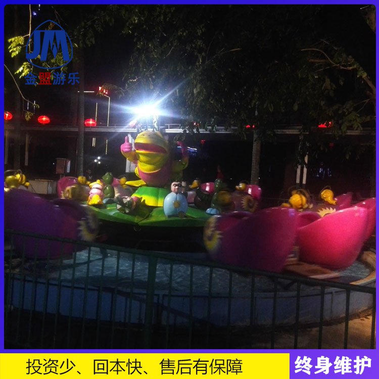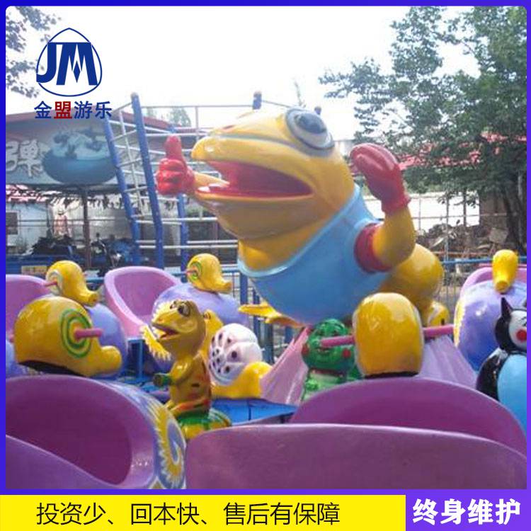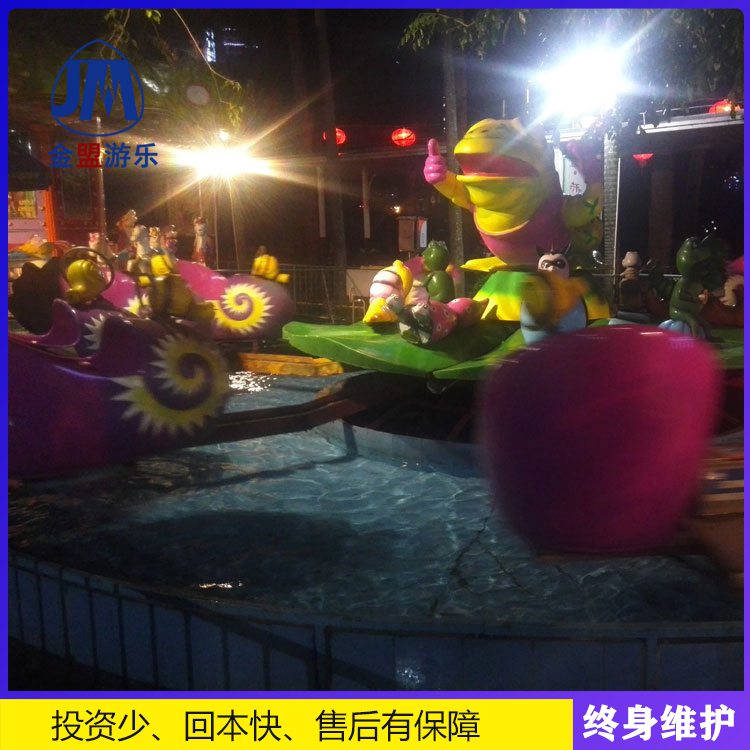 蜗牛特工队以其独到的造型,绚丽的灯火,美轮美奂的场景,动感十足的音乐,配以憨态可掬的蜗牛造型,笨笨的小蜗牛也可以很疯狂呢.... 来玩吧,亲爱的!蜗牛特工队中间荷叶上的青蛙领主会喷射水柱向游客攻击,参与感与互动性强。此套设备以后的戏水、ji战岛、欢乐海洋等这些旋转类的射击项目都是由他研发而成,从此蜗牛特工队红遍了大江南北,每个公园的必有设备,也给很多商家和游客带来了欢声笑语。