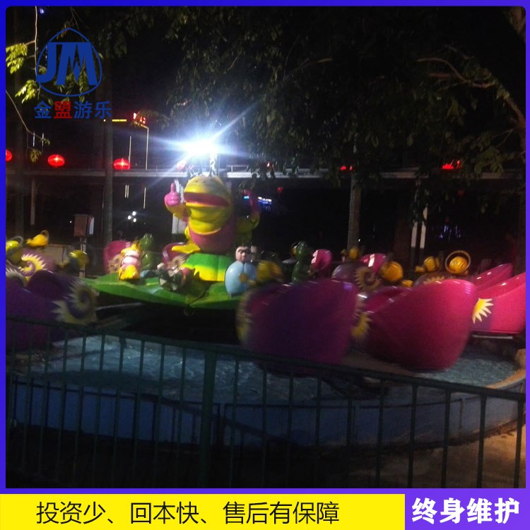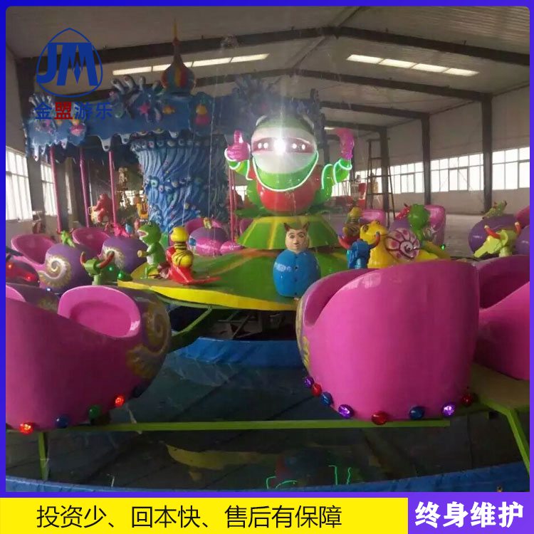 蜗牛特工队是一种旋转类的游艺机。乘员12人,游客使用战船上的蜗牛qiang射出水柱,she击“昆虫军团”目标,当目标被击中后会喷水、举手、躲藏等各种搞怪动作。并伴有欢快的音乐和语言。中间荷叶上的青蛙领主会喷射水柱向游客攻击,参与感与互动性强,使游客在欢乐的气氛中流连忘返。本设备为无基础可移动设备,适合广场和公园使用。