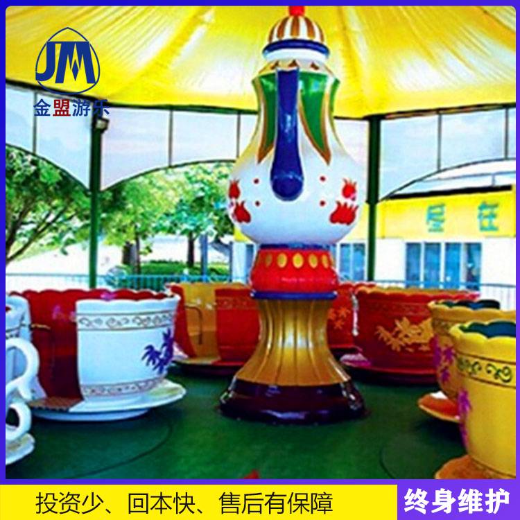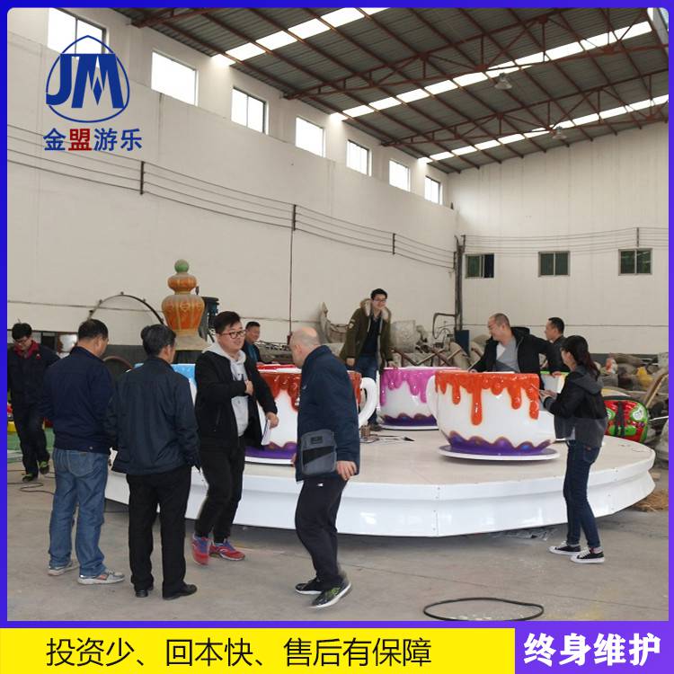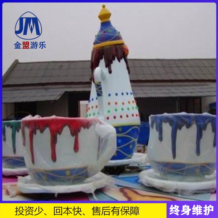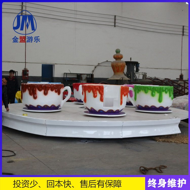 转转咖啡杯是转马类游艺机的一种, 由6个转杯和一个茶壶组成。6个茶杯围绕着茶壶转动,另外茶杯围绕自己的中心转动,给游客带来多重旋转的乐趣。每个茶杯可乘坐4人,适合家庭和不同年龄段的游客乘坐。该产品适用于各类公园、家庭中心、少年宫及室内外游乐场所。“旋转咖啡杯”是由机械、气压、油压、电器系统组成,是一种绕垂直轴中心旋转、杯子外观的座舱自身也能旋转的旋转类游艺设备。