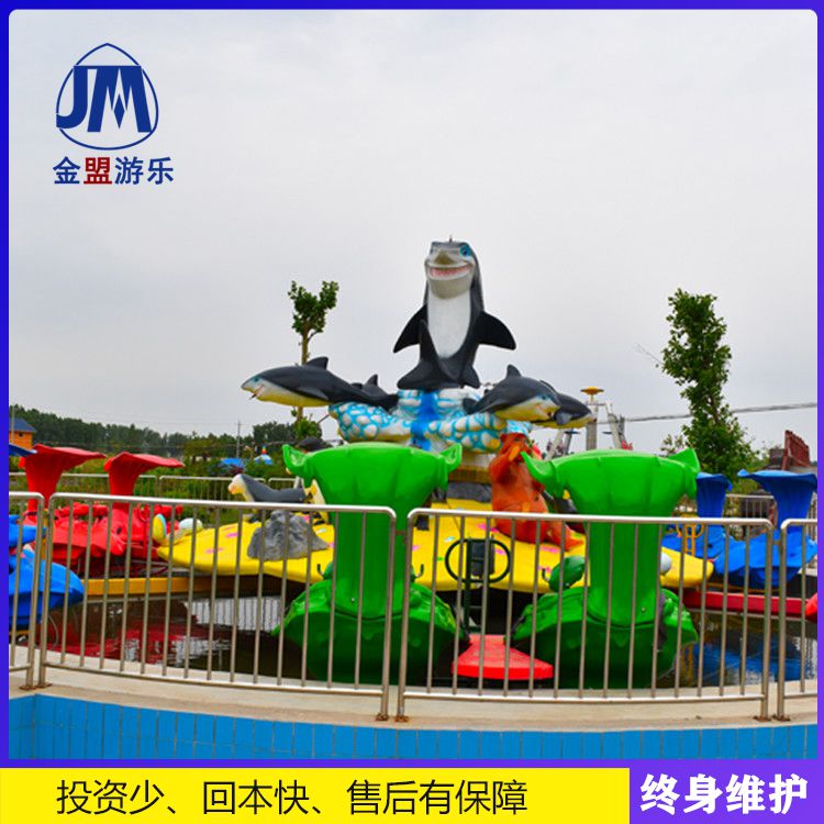 激战sha鱼岛是深受青少年,儿童欢迎的游乐项目,设备由12个座舱组成,每个座舱可乘坐两人,两个座舱为一组进行游戏。可由一位大人带着一位小孩进行亲子游戏,享受乐趣其设计新颖,结构独特,安全省电,造型美观。激战sha鱼岛是一种水上旋转类游艺机,此套设备造型是郑州金盟游乐公司的造型,设备大盘上一共24个卡通造型,有的能吐烟,有的能晃动,有的能喷水,独特的做座舱设计和鲜艳的色彩搭配构成了这款经典的旋转类游乐设施。